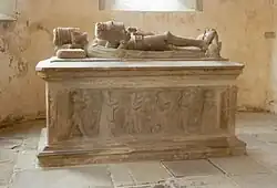 Der Schlussstein über der Tumba zeigt das Wappen des Grafen Gebhard von Querfurt.