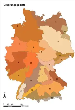 Es gilt die Gliederung Deutschlands in folgende 22 Vorkommensgebiete:
