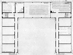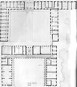 Die zwei Gebäudeblöcke waren in ihrer Nutzung klar getrennt, hintereinander angeordnet und nach Westen offen. Im vorderen, eingeschossigen Haus, das zur Straße hin lag, befanden sich die Wache, Personalräume, eine Krankenstation, die Wohnung für den Hausmeister sowie Wohnung für das Lehrpersonal und den Gebietsführer.[4] Über einen Innenhof gelangte man zum zweiten Gebäude, das zweistöckig erbaut war.