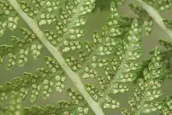 Sori des Gebirgs-Frauenfarns auf der Wedelunterseite