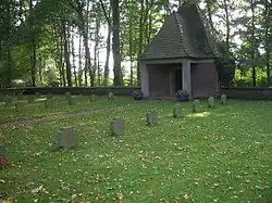 - Die Anlage aus den 1920er Jahren wird beherrscht von einer ausladenden Eiche, dem Symbol der Kaiserzeit. Sie überschattet 18 Grabplatten.