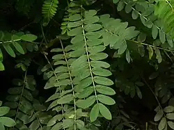 Die wechselständig angeordneten Laubblätter sind in Blattstiel und -spreite gegliedert und insgesamt meist 35, selten bis zu 50 Zentimeter lang. Die Laubblätter sind flaumig behaart und verkahlt später. Der Blattstiel und die Blattrhachis besitzen keine Drüsen.[1] Die Blattspreite ist paarig gefiedert mit meist 8 bis 16[1] selten bis zu 21 Paaren von Fiederblättchen. Die Stiele der Blättchen sind sehr kurz.[1] Die mehr oder weniger dunkelgrünen, ganzrandigen Blättchen sind bei einer Länge von 2 bis 5,5 Zentimetern sowie einer Breite von 1 bis 2 Zentimetern eiförmig-länglich bis länglich mit gerundeter und schiefer Basis und stumpfem oder etwas zugespitztem oberen Ende mit Stachelspitze.[2][3][1] Die Unterseite der Blättchen ist mehlig-weiß. Die spät abfallenden Nebenblätter sind bei einer Länge von 6 bis 17 Millimetern eiförmig-herzförmig mit zugespitztem oberen Ende.[1]