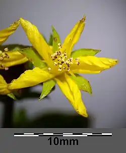 Die zwittrigen Blüten sind, radiärsymmetrisch und in der Regel fünfzählig, allerdings kommen auch vierzählige Blüten vor, mit doppelter Blütenhülle. Die meist fünf, manchmal vier Kelchblätter sind bei einer Länge von bis zu 5 Millimetern lanzettlich mit spitzen oberen Enden.[1] Die meist fünf, manchmal vier hellgelben Kronblätter sind nur 5 bis 8 Millimeter lang[2] und haben am Rand nur wenige (keine bis vier Stück) schwarze punkt- oder strichförmige Drüsen. Es sind 30 bis 40 Staubblätter vorhanden.