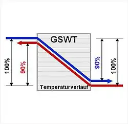 Die Effizienz kennzeichnet hier die Wirtschaftlichkeit des Wärmeübertragungsprozesses. Mit wenig Aufwand (Pumpen- und Ventilatorenergie) soll so viel wie möglich Nutzen (Wärmeleistung) erzielt werden. Eine Kennzahl der Effizienz ist das Verhältnis der Wärmeleistung zur Förderleistung von Pumpe und Ventilator. Bei Wärmeübertragungsprozessen wird diese Kennzahl zusätzlich auf einen Nutztemperaturhub von 1 °C bezogen. Bei dem GSWT liegt diese bezogene Effizienz bei gleichen Wärmekapazitätenströmen immer höher als 4:1. Soll beispielsweise die Lufttemperatur um 30 °C angehoben werden, ergibt sich eine Effizienz von 30*(4:1) = 120:1. Das heißt, für die Bereitstellung von 120 Teilen Wärmeleistung wird nur ein Teil Förderleistung benötigt.