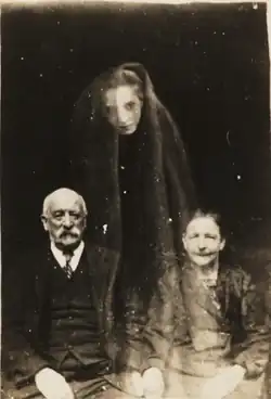 Andere Fotografen waren weniger erfolgreich im Verbergen ihrer Tricks. Der französische Fotograf Édouard Isidore Buguet, der selbst als Medium zuerst in London und später in Paris auftrat, wurde 1875 wegen Betrugs angeklagt. Er gab die Fälschung der Geisterfotografien zu. Zudem fand die Polizei bei der Durchsuchung seines Ateliers lebensgroße Puppen, falsche Bärte und mehrere hundert präparierte Fotografien. Buguet wurde zu einem Jahr Gefängnis und einer Geldstrafe verurteilt. Seine Anhänger, unter ihnen der englische Geistliche William Stainton Moses, vermuteten allerdings eine Verschwörung der katholischen Kirche gegen den Spiritisten Buguet.[14] Auch der in den 1890er Jahren aktive schottische Geisterfotograf David Duguid[15] und der um die Jahrhundertwende in Kalifornien wirkende Brite Edward Wyllie[16] wurden des Betrugs überführt.