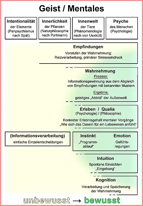 Schematische Darstellung, grobe Kategorisierung und Kurzdefinitionen der grundlegenden Begriffe aus Psychologie und/oder Philosophie zu geistigen Phänomenen