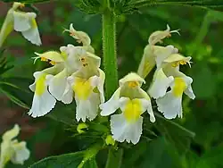 Den Blütenstand bilden 1 bis 4 übereinander stehende Scheinquirle.[2] Jeder Scheinquirl ist nur 4- bis 8-blütig.[2] Die zwittrigen Blüten sind zygomorph mit doppelter Blütenhülle. Der Kelch ist röhrig-glockig und ziemlich dicht mit angedrückten Seidenhaaren und abstehenden Drüsenhaaren besetzt.[2] Die Kelchröhre ist 6 bis 7 Millimeter lang, die Kelchzähne sind 3 Millimeter lang.[2] Die 2,5 bis 3 Zentimeter langen Blütenkronen sind blassgelb bis weißlich, oft mit einem gelben Schlund und manchmal mit kleinen purpurnen Schlundflecken. Jedoch ist nie die gesamte Unterlippe violett, wie dies manchmal beim ähnlichen Bunten Hohlzahn der Fall ist. Genau wie die oberen Laubblätter sind die Blüten flaumig und drüsig behaart. Die Oberlippe ist 6 Millimeter lang, die herabgeschlagene Unterlippe ist 8 bis 10 Millimeter lang. Die Unterlippe ist an den Lappen gezähnelt.[2] Die Klausen sind 2 Millimeter lang, braun und glatt.[2] Die Blütezeit reicht in Deutschland von Juli bis August (bis Oktober?).