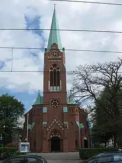 - Thomaskirche mit markanter Bugform des Chores, erbaut 1963–1965[6]