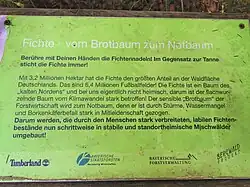 In Deutschland wäre die Gemeine Fichte von Natur aus nur zu geringen Anteilen am Waldaufbau beteiligt. Der natürliche Verbreitungsschwerpunkt liegt in den Bergwäldern der Alpen und der höchsten Mittelgebirge. Von den naturnahen Fichtenwäldern in Deutschland nimmt der Bergfichtenwald flächenmäßig mit 46 Prozent von 14.500 Hektar den größten Anteil ein. Die deutschen Waldbesitzer und Forstleute haben aber in den letzten Jahrhunderten die Gemeine Fichte weit über ihr natürliches Verbreitungsgebiet hinaus angebaut. Wegen ihres im Vergleich zu anderen Baumarten schnelleren Wachstums und der Möglichkeit, bereits in jüngeren Beständen Holz kostendeckend zu ernten, wird die Fichte auch als „Brotbaum“ der deutschen Forstwirtschaft bezeichnet. Nach der Waldinventur 2022 ist sie (nach der Kiefer) mit 2,3 Millionen Hektar und 20,9 Prozent Flächenanteil die zweithäufigste Baumart der Wälder in Deutschland.[18] Noch in der zweiten Hälfte des 20. Jahrhunderts wurden weite Flächen mit Fichtenreinbeständen aufgeforstet. Hierbei wurden auch wenig geeignete Standorte, wie zum Beispiel wechselfeuchte Böden, bepflanzt, da die Wüchsigkeit oft vor Bestandessicherheit ging. Heute werden zahlreiche Fichtenbestände wieder in standortgemäße Mischwälder umgewandelt. So nahm die Fichtenfläche in Deutschland zwischen 2002 und 2012 um 240.000 Hektar ab.[19] Einerseits sind standörtliche Gegebenheiten hierfür der Anlass, andererseits aber auch im wirtschaftlichen Bereich die Konkurrenz mit der noch besser wüchsigen Douglasie.