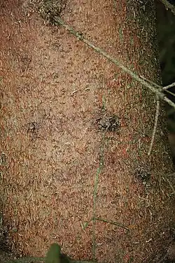 Der Stamm zeigt in tieferen Lagen eine rötlich-braun gefärbte, feinschuppige Rinde, wogegen in Gebirgslagen die rötliche Farbe eher Grautöne annimmt. Die auffällige Rindenfärbung ist offenbar für die irreführende Bezeichnung „Rottanne“ verantwortlich. Die graubraune Borke älterer Bäume ist ein gutes Unterscheidungsmerkmal zur hellgrauen Rinde der Weiß-Tanne. Fichtenborke blättert in unregelmäßigen Schuppen ab, der Stamm der Weiß-Tanne ist wesentlich glatter.
