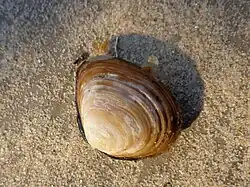 Die Länge der Muschelschalen beträgt 9–14 mm. Die dünnwandigen und ovalen Schalen sind von hell gelblicher bis dunkel bräunlicher oder grauer Färbung mit leicht unregelmäßigen konzentrischen Streifen und stark aufgebläht. Junge Muscheln sind häufig heller gefärbt als die älteren Tiere. Das Verhältnis von Höhe zu Länge der Schalen beträgt 0,8–0,88.[1] Der Weichkörper ist blass durchscheinend bis bläulich gefärbt.