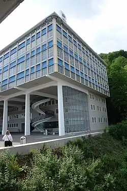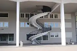 Drei unterschiedlich ausgestaltete Treppen mit prägnanter Formgebung ermöglichen den Zutritt zu den oberen Stockwerken. Ein vom Gebäude abgelöstes, gedecktes Treppenhaus führt den Hang hinauf, hebt sich aber durch zwei V-förmig gestellte Doppelstützen vom Terrain ab. Sechs Treppenläufe mit je elf Stufen werden durch Zwischenpodeste etappiert, der mittlere Handlauf ist mit einem Lichtband versehen. In der Mitte der Vorhalle windet sich eine spiralförmige, frei stehende Wendeltreppe in zwei vollen Umdrehungen hinauf zu einem Einschnitt im Boden des vierten Stockwerks. Am hangseitigen Ende der Vorhalle führt eine Treppe im Zickzack hinauf zum Quertrakt.[2]