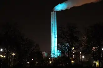 Die Rauchgase aus den Verbrennungsprozessen werden über einen 97,5 m hohen Kamin abgeführt.