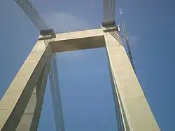 Innerhalb der Rahmen ist wiederum eine große V-förmige Struktur aus 2 × 2 breiten Stahlbetonstreben angeordnet, die von einer durch den Pylonrahmen weitgehend verdeckten A-Struktur überlagert wird. Sie wird deshalb auch als XX-Pfeiler bezeichnet. Dieser XX-Pfeiler trägt einen 44,39 m langen Pfeilertisch, der aus einem geschlossenen, dreizelligen Spannbeton-Hohlkasten mit einer Bauhöhe von 5 m besteht. Die Pfeilertische wurden in beide Richtungen durch 72,33 m lange Spannbeton-Kragarme verlängert, die auf Lehrgerüsten gebaut wurden, die von einem Schwimmkran eingehoben und an ihrem äußeren Ende durch Hilfspfeiler abgestützt wurden. An ihren äußeren Enden ist jeweils ein seitlich über den Rand hinausragender Seilquerträger eingebaut. Damit entstand ein Fahrbahnträger von 189,05 m Länge. Anschließend wurden je 16 vollverschlossene, 7,4 cm starke Schrägseile über die Kabelsattellager an den Pylonspitzen gezogen und in den Seilquerträgern verankert.