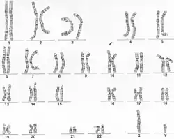 Bei den Eukaryoten besteht das Kern-Genom (Karyom oder Nucleom,[7] nicht zu verwechseln mit dem „Kerngenom“ als Teil des Pangenoms) aus mehreren bis zahlreichen strangförmigen Chromosomen. Die Kern-DNA wird auch als nukleäre DNA (nDNA) bezeichnet. Die Anzahl der Chromosomen ist artspezifisch verschieden und kann zwischen zwei (beim Pferdespulwurm) und mehreren hundert (bei manchen Farnen) variieren. Außerdem ändert sich die Chromosomenzahl beim Wechsel der Kernphase (Meiose und Karyogamie). Charakteristisch für eukaryotische Genome ist weiterhin ein hoher Anteil an nichtcodierender DNA (beim Menschen etwa 95 %) und die Intron-Exon-Struktur der Gene.
