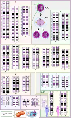 Stand 2020 hat das haploide Genom einer menschlichen Zelle eine Länge von etwa 3,1 Milliarden Basenpaaren.[15] Bei einem diploiden Genom und einer Länge von 0,34 nm pro Basenpaar ergibt sich damit in jedem Zellkern eine Gesamtlänge von gut zwei 2 Metern DNA.[17]