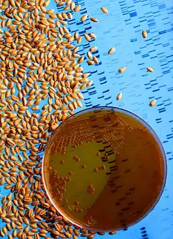 Elemente der Gentechnik: Bakterienkultur in einer Schale, Saatgut und durch Elektrophorese sichtbar gemachte DNA-Fragmente