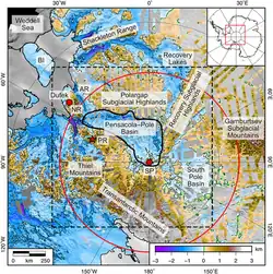 Weitere ostantarktische subglaziale Gebirgskomplexe sind u. a. die Polargap Subglacial Highlands und Recovery Subglacial Highlands (siehe → Pensacola-Pole Basin).