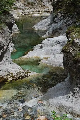 - ↑ Vojko Strahovnik (Hrsg.): Geopark Karavanke/Karawanken. Skrivnosti zapisane v kamninah-In Stein geschriebene Geheimnisse-Secrets written in Stone. GEAart, Nazarje 2015, ISBN 978-961-93902-0-7, S. 30.