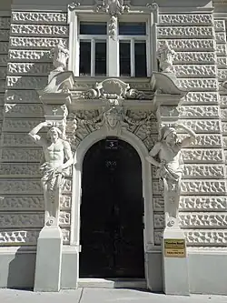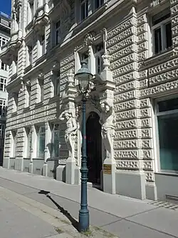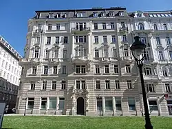 Das späthistoristische Eckhaus zwischen Georg-Coch-Platz und Biberstraße wurde 1904 von Leopold Fuchs erbaut. Es besitzt eine abgerundete Ecke; die Fassade ist durch ondulierende Balkone akzentuiert. Das Portal wird von zwei Hermenfiguren flankiert; darüber befindet sich ein Maskenrelief und über gesprengtem Segmentgiebel sind Vasen zu sehen. Hinter dem schmiedeeisernen Tor öffnet sich ein bemerkenswertes Foyer mit Marmorverkleidung und stuckierten Pendentifkuppeln. Das Stiegenhaus ist ebenfalls stuckiert.