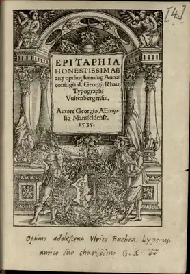 - Apocalypsis Johannis,Apocalypsis Johannis Explicatio Apocalypsis Iohannis Perspicua & breuis Tradita et Recognita a Doctore Davide Chytraeo Abhandlung: Elegiaco Carmine Condita A Georgio Aemilio. Wittenberg 1575 (bei Johann Crato).