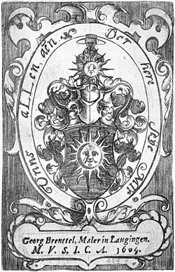 - Aus den Jahren 1604–1609; in vier Varianten, die sich durch Beschriftung unterscheiden. Beschriftung einer der Variante lautet im Schild: „Georg Brenttel, Maler in Laugingen / M.V.S.I.C.A. 1604“ und um das Wappen: „Der Herr seÿe MIt Vnns aLLen, aēn“; Autorschaft unbekannt. Alle Varianten vorhanden bei British Museum London, Department of prints and drawings.
