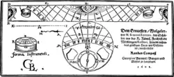 - Figur einer runden Büchse mit Sonnenuhr im Boden und am inneren Rand, 1608 (Holzschnitt und Erklärung)