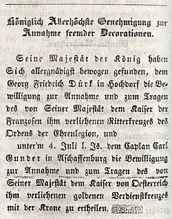 Nachdem Napoleon Bonapartes Neffe, als Napoleon III., 1852 ebenfalls französischer Kaiser geworden war, zog es Dürk nach Paris, um den einst versprochenen Orden zu erlangen. Da ihn die eigene Familie stets von dem Vorhaben abbringen wollte, unterstützten ihn der katholische Ortspfarrer Martin Ludwig Frübis[2] sowie der Bürgermeister und Zigarrenfabrikant Peter Zimmermann. Sie besorgten dem betagten Mann bei den Behörden die notwendigen Papiere und stellten ihm ein Leumundszeugnis aus. Damit reiste Georg Friedrich Dürk 1867, mit 79 Jahren, nach Paris. Über den bayerischen Gesandten Maximilian Joseph Freiherr Pergler von Perglas gelang es Dürk eine Audienz bei Kaiser Napoleon III. zu erwirken. Dieser war von dem speziell zu ihm gereisten Veteranen und dessen detaillierten Schilderungen über seinen Onkel stark beeindruckt und dekorierte ihn am Ende der Audienz eigenhändig mit dem Kreuz der französischen Ehrenlegion. Außerdem überreichte er ihm 1000 Franc Belohnung und veranlasste eine Rente von 1200 Franc jährlich, die auch tatsächlich bis zum Sturz der französischen Monarchie ausbezahlt wurde. Beim Verlassen des Schlosses, mit dem angelegten Kreuz der Ehrenlegion, präsentierten die kaiserlichen Palastwachen vor Dürk, was er daheim als die größte Ehre bezeichnete, die ihm jemals im Leben widerfahren sei. Sein Sohn Adam holte ihn bei der Rückkehr in Neustadt an der Weinstraße von der Bahn ab und er wurde triumphal in Hochdorf empfangen. König Ludwig II. von Bayern genehmigte am 4. Juli 1867 die Annahme und das Tragen der hohen ausländischen Auszeichnung.[3]