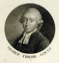 - ↑ Johann Rudolph Gottlieb Beyer (Hrsg.): Allgemeines Magazin für Prediger nach den Bedürfnissen unserer Zeit 11. Band, 6. Stück 1795 [2] S. 511:[1] Bild von Götz, S. 624:114 Lebenslauf