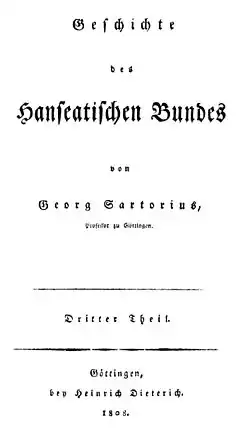 1795 legte Sartorius „die erste umfassende Monographie zum Bauernkrieg vor.“[1] Sartorius’ Hauptwerk ist die Geschichte des Hanseatischen Bundes, die in drei Bänden von 1802 bis 1808 erschien. Seine Forschungen zu diesem Thema begründeten die umfangreichen Forschungen zum Thema Hanse im 19. Jahrhundert, das insbesondere im Zuge der Reichseinigung der zweiten Hälfte dieses Thema mit zeitweilig verklärter Euphorie aufnahm. Eine zweite von Sartorius selbst noch vorbereitete Auflage des Werks erschien post mortem im Jahr 1830. Sartorius wurde auch als Übersetzer von Adam Smith’ Wealth of Nations bekannt. Als Wirtschaftshistoriker und Ökonom hielt er auch Vorlesungen zum Steuer- und Abgabenrecht.