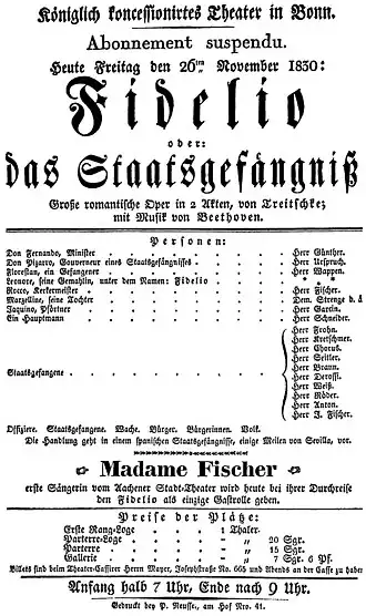 | Oper | Fidelio | J.-N. Bouilly, Joseph Sonnleithner, G. F. Treitschke, 2 Aufzüge | Ludwig van Beethoven | 23.05.1814 Wien, Kärntnertortheater |