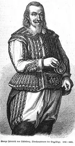 Georg Friedrich von Schönberg entstammte dem sächsischen Adelsgeschlecht derer von Schönberg und war der Sohn des Kammerjunkers Georg von Schönberg d. J. († 1614). Nach seinem Tod erschien die gehaltene Leichenpredigt in Druck. Seine Söhne waren Caspar von Schönberg (Berghauptmann) und Gotthelf Friedrich von Schönberg (1631–1708).