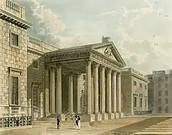 Der Prinz war bereits vor Beginn seiner Regentschaft Bauherr mehrerer neuer und stilbildender Gebäude gewesen und beauftragte wiederholt Umbauten an den von ihm bewohnten Palästen. Seine Bauaktivitäten waren eine der Ursachen für seine anhaltend hohen Schulden. Allein für den Bau des palastähnlichen Stalls für seine Pferde in Brighton, bei dem sich vierundvierzig Pferdeboxen ringförmig um einen Brunnen gruppieren, der wiederum von einer Kuppel überkrönt war, gab der damalige Prince of Wales über 54.000 Pfund aus.[102] Der Royal Pavilion im aufstrebenden Seebad Brighton ist vermutlich das Bauwerk, das neben dem Buckingham-Palast am meisten mit ihm in Verbindung gebracht wird. Der Palast, der von John Nash schon zur Regentschaftszeit vollendet wurde, orientiert sich äußerlich an der Baukunst des Mogulreiches. Mit seiner überwiegend chinesisch inspirierten Inneneinrichtung galt er als einer der exotischsten Paläste Europas.[103] Zu den von zahlreichen Besuchern teils bewunderten, teils wegen der luxuriösen Opulenz belächelten Besonderheiten des Palastes zählte unter anderem die zeltförmige Decke der Banketthalle, in deren Mitte ein großer silberner Drache eine riesige Gaslampe hielt.[104] Von John Nash stammt auch die Planung des Regent’s Parks, der Regent Street und des Trafalgar Squares, die alle auf Veranlassung von Georg IV. entstanden.