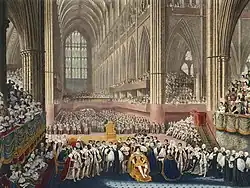 Die Krönung Georgs IV. fand aufgrund des Prozesses mit einjähriger Verspätung am 19. Juli 1821 in der Westminster Abbey statt, ohne dass die Königin daran teilnehmen durfte. Caroline von Braunschweig wurde sogar der Zutritt zur Westminster Abbey verweigert, als sie diesen in Begleitung von Lord Hood verlangte.[74] Sein extravaganter Geschmack ließ Georg IV. keinen Aufwand scheuen. Die Gesamtkosten der Krönungsfeierlichkeiten waren enorm: Mit 243.000 Pfund überstiegen sie die Kosten der Krönung Georgs III. um mehr als das 24-fache.[75] Bezahlt wurden sie zur Hälfte aus französischen Reparationszahlungen aufgrund des Zweiten Pariser Friedens. Die neue Krönungskrone Georgs IV. wurde hierfür eigens angefertigt und kostete über 50.000 Pfund. Als besonders kostspielig erwies sich auch der 24.000 Pfund teure Krönungsornat[76]; Georg hatte dafür sogar Schneider nach Paris entsandt, um den Krönungsornat Napoleons zu kopieren.[77] Das Ornat gelangte später in Madame Tussauds Wachsfigurenkabinett, wurde aber für die Krönung König Georgs V. 1911 wiederentdeckt und seither für alle Krönungen wiederverwendet.[78] Bei der traditionellen Krönungsliturgie hatte der Erzbischof von Canterbury, Charles Manners-Sutton, die üblichen Erwähnungen der Königin zu unterlassen. Der König litt unter dem schweren Ornat und der Krone an dem heißen Sommertag so sehr, dass er später sagte, er würde diese Strapazen auch für ein weiteres Königreich nicht noch einmal erdulden wollen.[79]