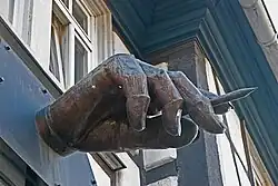 Von Georg K. Glaser entworfene Kupferskulptur „Die denkende Hand“ in Frankfurt-Höchst