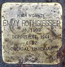 - ↑ Frauke Steinhäuser: Emmy Rothgiesser * 1900 / Graumannsweg 48 (Hamburg-Nord, Hohenfelde), auf der Seite stolpersteine-hamburg.de in der Bearbeitung vom Mai 2016, zuletzt abgerufen am 2. Mai 2017