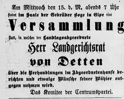 - ↑ Mann, Bernhard (Bearb.): Biographisches Handbuch für das Preußische Abgeordnetenhaus. 1867–1918. Mitarbeit von Martin Doerry, Cornelia Rauh und Thomas Kühne. Düsseldorf : Droste Verlag, 1988, S. 105 (Handbücher zur Geschichte des Parlamentarismus und der politischen Parteien : Bd. 3); zu den Wahlergebnissen siehe Thomas Kühne: Handbuch der Wahlen zum Preußischen Abgeordnetenhaus 1867–1918. Wahlergebnisse, Wahlbündnisse und Wahlkandidaten (= Handbücher zur Geschichte des Parlamentarismus und der politischen Parteien. Band 6). Droste, Düsseldorf 1994, ISBN 3-7700-5182-3, S. 611–613 und S. 616–617.