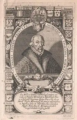 Als Bischof vertrat Georg von Schönenberg entschieden die Positionen der katholischen Kirche und befand sich deshalb in ständigen Streitigkeiten mit den protestantischen Ständen der Kurpfalz und der Stadt Worms. Er residierte daher auch überwiegend außerhalb der Stadt, und zwar in seinem Landschloss zu Dirmstein.[14] 1594 verfasste der Bischof eine diesbezügliche Beschwerdeschrift an den Regensburger Reichstag; einer der Hauptklagepunkte war die fortdauernde Okkupation des Wormser Cyriakusstiftes durch den Pfälzer Kurfürsten. Der Oberhirte zog viele Kleriker in sein Bistum, die ihre Ausbildung am renommierten Collegium Germanicum in Rom erhalten hatten. Georg Seiblin († 1591) fungierte als sein Kanzler und Gesandter.[15]