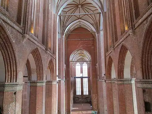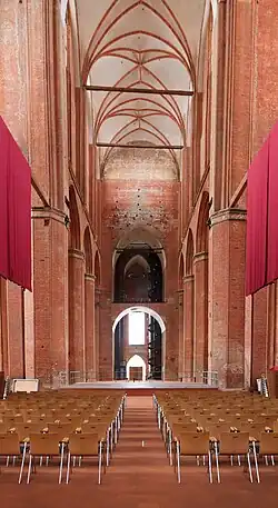Da die Einsatzkapellen die gleich Höhe wie die ziemlich breiten Seitenschiffe haben und wie in der Lübecker Marienkirche auf ein Triforiumsgeschoss verzichtet wurde, sind die Obergadenfenster zu mehr als der Hälfte ihrer Höhe vermauert. Die Mittelschiffsarkaden werden von fast schmucklosen Achteckpfeilern getragen. Die Dienste zu den Mittelschiffsgewölben beginnen erst auf Höhe der Scheitel der Arkadenbögen, oftmals mit Konsolen in Form von Menschenköpfen aus Kunststein, der einzigen figürlichen Bauplastik des Kirchenraums. Der Seitenschub der Mittelschiffsgewölbe wurde durch hölzerne Zuganker abgefangen. Der eingezogene Westturm ist aus Kostengründen unvollendet geblieben. Sein Stumpf endet heute auf Höhe des Mittelschiffsfirstes.
