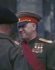 Am 24. Juni 1945 nahm Schukow, einen Achal-Tekkiner-Schimmel reitend, auf dem Roten Platz in Moskau unter den Augen Stalins die Siegesparade der Roten Armee ab und hielt anschließend von der Tribüne des Lenin-Mausoleums herab die Siegesrede. Stalin ließ ihm den Vortritt, weil er selbst nicht mit den desaströsen Niederlagen der Jahre 1941 und 1942 assoziiert werden wollte. Erst in den folgenden Jahren wurde der Sieg über Nazi-Deutschland und Stalins angebliches militärisches Genie aber fester Bestandteil des Personenkults um ihn.[11]