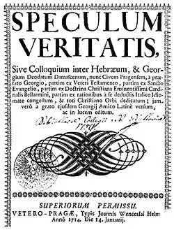 - Speculum veritatis, sive colloquium inter Hebraeum et Georgium Deodatum Damascenum, nunc civem Pragensem (Prag, 1714)