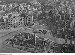 Blick vom Turm des Neuen Rathauses über die Ruinen am Georgplatz hin zur Bürgerwiese, 1945/46.