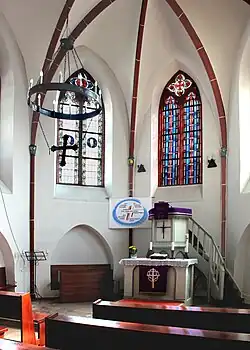 Der Chor mit Dreiachtelschluss ist zur Mosel hin bzw. nach Osten ausgerichtet. Die fünf Chorfenster mit Vierpässen über je zwei Dreipässen sind wiederhergestellt. In der hellen Verglasung der vorderen Fenster aus der Zeit um 1900 sind links in kleinen Tondos Philipp Melanchthon und Martin Luther, rechts Johannes Calvin und Friedrich der Weise von Sachsen, ein Förderer Luthers, dargestellt.[4] Ein kleines Spitzbogenfenster an der Südwand ist einfach gestaltet. Spitzbogige Nischen gliedern die Innenwände, im Kirchenschiff 2,30 Meter und im Chor 1,85 Meter hoch. Das erneuerte Kreuzgewölbe dürfte dem ursprünglichen entsprechen. Ein neugotisches Westportal wurde 1888 vermauert und der Eingang an die Südseite verlegt.