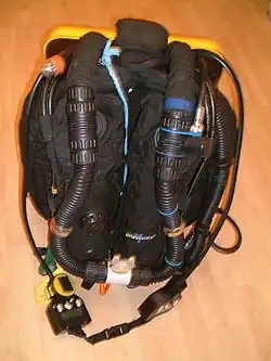 Neben dem Atemgas-Vorrat und dem Atemregler oder Helm trägt ein Gerätetaucher eine Tarierweste, Taucheranzug, Bleigewichte, die Tauchergrundausrüstung (Tauchmaske, Schnorchel, Taucherflossen), Füßlinge sowie Instrumente zur Kontrolle der Orientierung (Kompass), des Atemgasvorrates (Finimeter), der Tauchzeit (Taucheruhr), der Tauchtiefe (Tiefenmesser) und eine Dekompressionstabelle oder einen Tauchcomputer zur Berechnung eines sicheren Aufstiegs.[1]