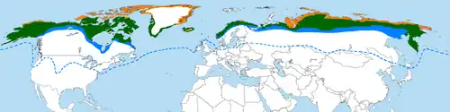 Der Gerfalke ist eine zirkumpolar verbreitete Falkenart, dessen Brutgebiete in der Arktis und Subarktis liegen. Die südlichsten Brutnachweise liegen für Eurasien auf der Kamtschatka-Halbinsel bei 54° 35′ N, 161° 7′ O und für Nordamerika auf Long Island an der südöstlichen Küste der Hudson-Bay bei 54° 53′ N, 80° 30′ W.[12] In Europa ist er ein Brutvogel in Island, Norwegen, Schweden, Finnland und Russland. In Asien brütet er nur in Russland. Die amerikanischen Brutgebiete liegen im US-amerikanischen Bundesstaat Alaska sowie Kanada und Grönland.