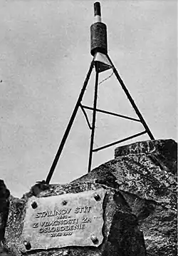 Anlässlich des fünften Jahrestags der Gründung des tschechoslowakischen Staates wurde am 12. August 1923 während einer Feier eine Blechflagge auf einem 5 m hohen Mast auf dem Gipfel installiert. Die vom slowakischen Lehrer Miloš Janoška geleitete Feier mit 200 Teilnehmern wurde um etwa zweieinhalb Monate vor dem eigentlichen Jahrestag am 28. Oktober vorgezogen, um die Ferien und sommerliches Wetter ausnutzen zu können. Die Blechflagge verschwand im nächsten Jahr während eines Sturms. Der Umbenennung in Stalin-Spitze im November 1949 folgte die Aufstellung einer 46 kg schweren Bronzetafel mit dem neuen Namen im Mai 1950. Bis 1956, als dieser Name während der Entstalinisierung gestrichen wurde, musste die Tafel wegen Beschädigung zweimal getauscht werden, wobei die Ersatztafeln aus billigeren Materialien gefertigt wurden.[9] Im Zuge der Umstellung des Höhensystems in der Tschechoslowakei vom Pegel Triest zum Kronstädter Pegel wurde 1958–59 auch die Höhe von Gerlachovský štít nochmal gemessen und kam zum Ergebnis von 2654 m, später auf 2654,4 m präzisiert.[7]