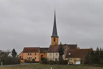 Die Kirche ist ein großer, geosteter Saalbau mit einem Ostchor aus dem beginnenden 15. Jahrhundert. Die Untergeschosse des fünfgeschossigen Turmes an der Südostecke des Langhauses stammen ebenfalls aus dem 15. Jahrhundert. Um 1600 wurde er aufgestockt und mit dem charakteristischen Julius-Echter-Spitzhelm versehen. 1751 ergänzte man das heute noch bestehende Langhaus. Es wurde nach einem Sturm im Jahr 1879 erneuert.