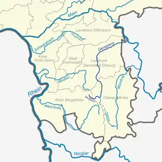 Verlauf der Gersprenz unter anderem mit Main und Rhein