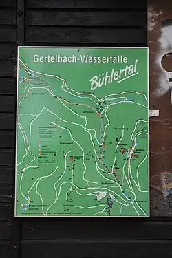 Der Gertelbach entspringt einem Quellhorizont zwischen dem Unteren Buntsandstein und dem Bühlertal-Granit westlich der Schwarzwaldhochstraße und mündet nach nur 2,5 km, 330 Höhenmeter unterhalb der Quelle, in den (kleineren) Bühlot-Zufluss Wiedenbach. Im steilsten Abschnitt, etwa 800 m vor der Mündung, stürzt der Bach kaskadenartig 220 Meter tief in etwa 15 Fallstufen von 2 bis 6 Metern Höhe. Der Hauptfallbereich im oberen Drittel der Talstufe misst 62 Meter und endet auf einer Höhe von gut 600 m ü. NHN.[1]