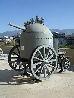Die Entwicklung von Geschütztürmen für Landfahrzeuge folgte den Erfindungen aus anderen waffentechnischen Anwendungsbereichen. Drehbare Geschütze auf Lafetten kannte man von Schiffen und Küstenbatterien. Den Geschützen verlieh man mit Fahrpanzern eingeschränkte Mobilität und Panzerschutz. Um die Mobilität zu verbessern, entwickelte der Ingenieur Franz Klotz entwickelte um 1900 bei Škoda in Pilsen einen „fahrbaren Geschützpanzerturm“, zu dem er am 26. Januar 1903 das österreichische Patent Nummer 10504 erhielt.[2] Mit Entwicklungen zur Motorisierung beim Militär folgten bald weitere Erfindungen. 1906 stellt Paul Daimler seinen neu entwickelt Panzerwagen vor, der als „Austro-Daimler Panzerwagen“ bekannt wurde und über eine gepanzerte Kuppel mit Maschinengewehr verfügte. Diesen ersten Panzerwagen folgten weitere Modelle mit drehbaren gepanzerten Geschützkuppeln. Das Gewicht von Geschützen in Geschütztürmen begrenzte allerdings noch die Realisierungsmöglichkeiten bei Radfahrzeugen. Mit Kettenlaufwerk wurde 1911 das Burstyn-Motorgeschütz vorgestellt. Es war mit einer drehbaren 37-mm-Schnellfeuerkanone in einer gepanzerten Geschützkuppel ausgestattet.